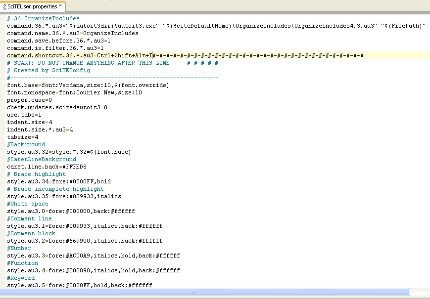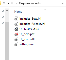Scite Version 3.6.0 Aug 4 2015 17:34:27Code: SciTEUser.properties# 36 OrganizeIncludes command.36.*.au3="$(autoit3dir)\autoit3.exe" "$(SciteDefaultHome)\OrganizeIncludes\OI_1.0.0.50.au3" "$(FilePath)" command.name.36.*.au3=OrganizeIncludes command.save.before.36.*.au3=1 command.is.filter.36.*.au3=1 command.shortcut.36.*.au3=Ctrl+Shift+Alt+I title.full.path=1Code: settings.ini
