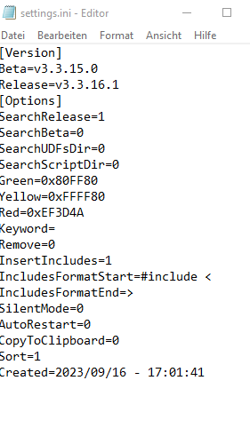 Alles anzeigen[Version] Beta= Release=v3.3.14.2 [Options] SearchRelease=1 SearchBeta=0 SearchUDFsDir=0 SearchScriptDir=0 Green=0x80FF80 Yellow=0xFFFF80 Red=0xEF3D4A Keyword= Remove=0 InsertIncludes=1 IncludesFormatStart=#include < IncludesFormatEnd=> SilentMode=0 AutoRestart=1 CopyToClipboard=0 Sort=1 Created=2015/11/06 - 08:08:51