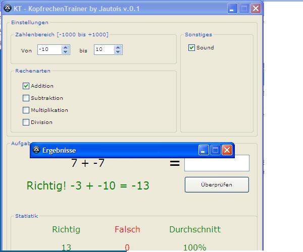ich hab mich mal wieder in einem Script versucht, indem es darum geht die Hirnmasse zu trainieren; einen kleinen Kopfrechnen-Trainer. Zur Zeit kann man zwischen 4 Rechenarten wählen ( Addition, Subtraktion, Multiplikation und Division). Demnächst kommt noch ein paar dazu (Wurzel ziehen, Rechenarten durchmischt, Potzenen). Habt ihr Aufgaben gelöst könnt ihr Euch den "Verlauf" Eures Durchschnitts anzeigen lassen.