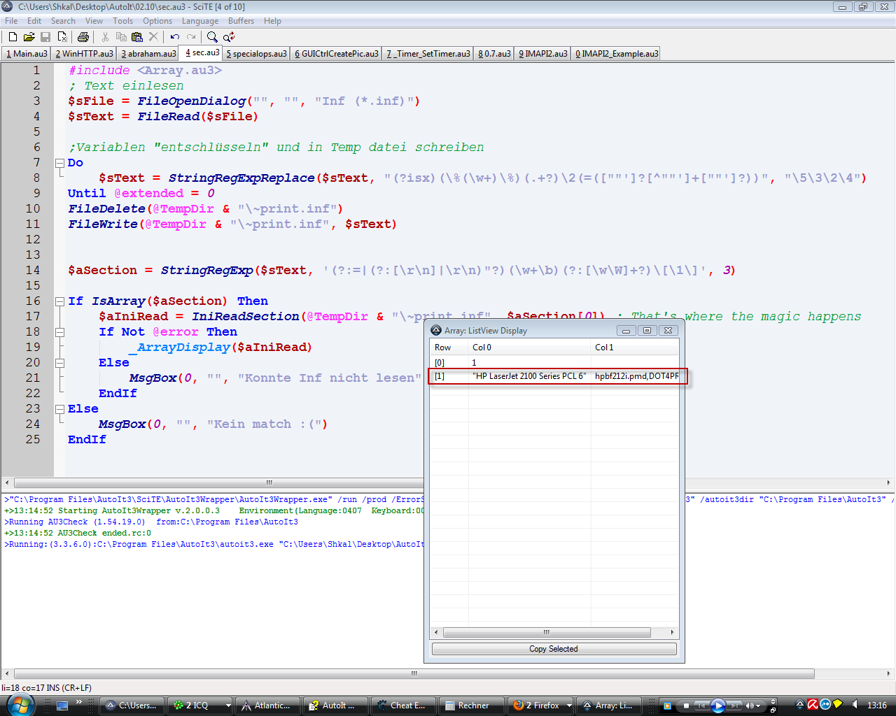 ich will gerne eine Inf Datei auslesen (Inf-Datei von Druckertreiber) da ich an einen Script Arbeite was hier auf meiner Arbeit sämtliche drucker mit 2klicks installiert, jedoch wäre es sehr viel Arbeit die Druckernamen aus den Inf-Dateien per hand rauszusuchen und als Variablen im Script zu speichern(wie ich es mit 4 Druckern gemacht habe zum test). Ich denke mal das man das Problem mit RegExp lösen kann allerdings kenne ich mich damit noch NULL aus. Desweiteren besteht das Problem das die Inf-Dateien nicht gleichmäßig aufgebaut sind, jeder Herrsteller kann sie im prinzip selbst gestallten, nur das Shema bleibt gleich.