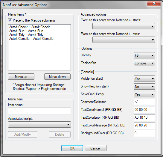 Um die Makros im Makro-Menü einzubinden ruft ihr auf: <Erweiterungen><NppExec><Advanced Options ...> und setzt den Haken bei "Place to the Macros submenu". Dann könnt ihr die Makroskripte bei "Associated script:" auswählen und hinzufügen (bei Bedarf den Itemnamen ändern).
