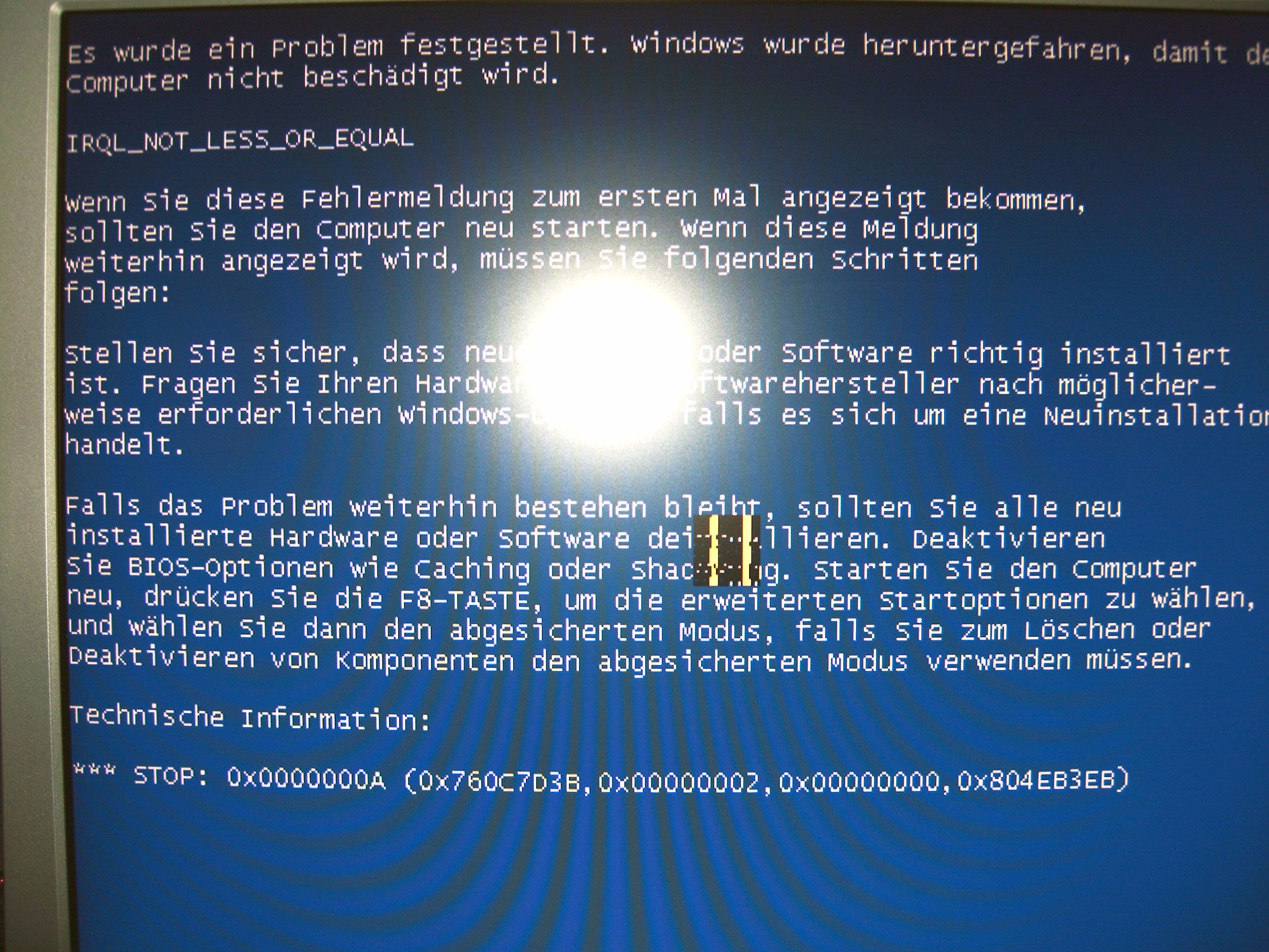 hab nen foto von den bluescreen angehängt (man bemerke den komischen fleck an der rechten mittleren seite , der kommt auch immer , immer verschieden....)