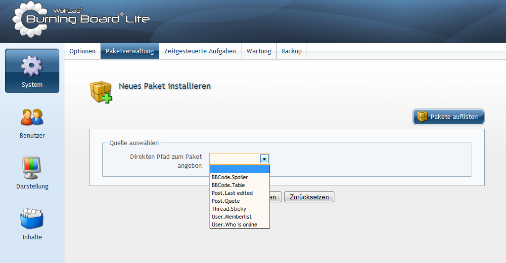 Runterladen > Admin Control Panel > System > Paketverwaltung > Paket installieren > Paket auswählen und hochladen