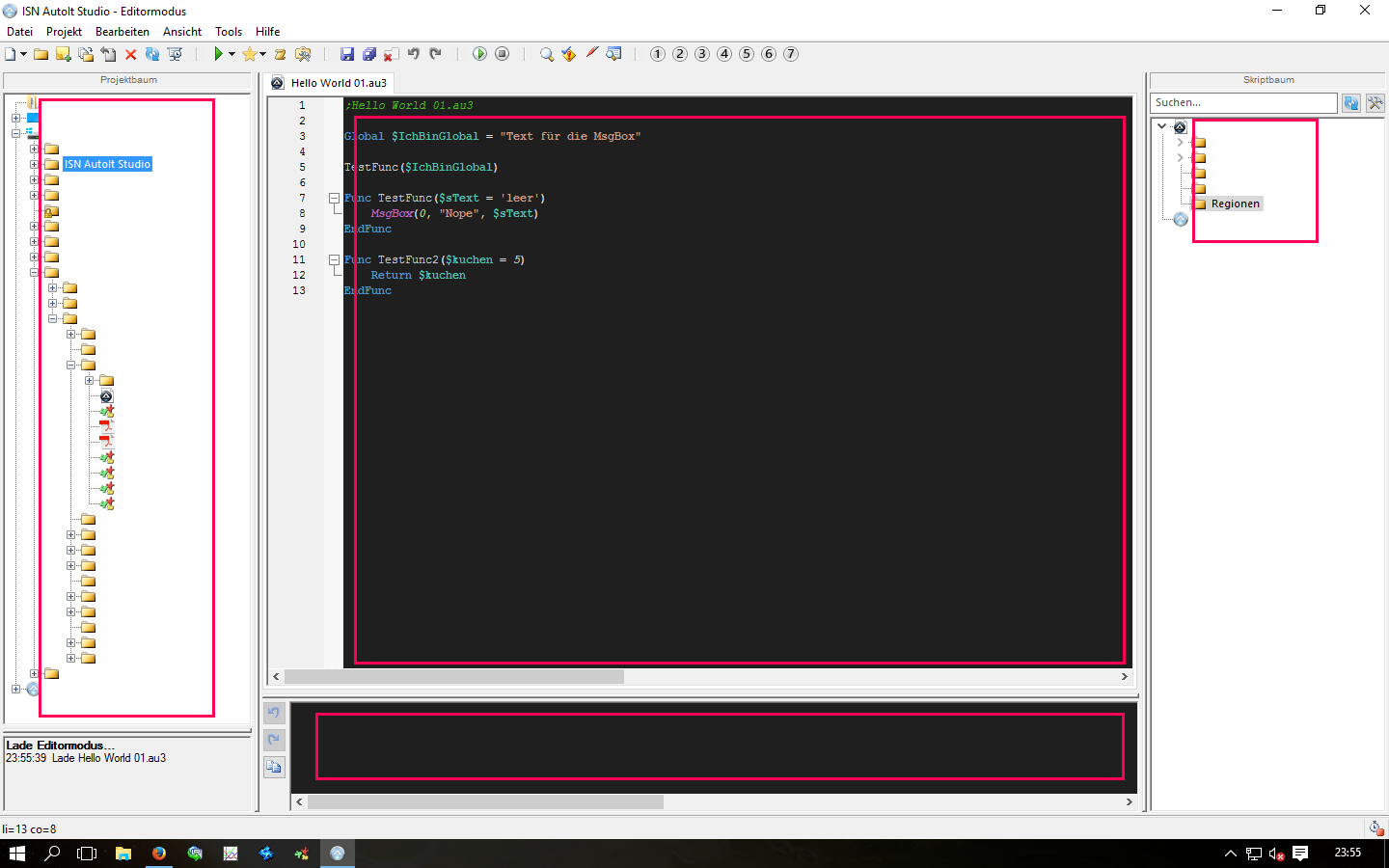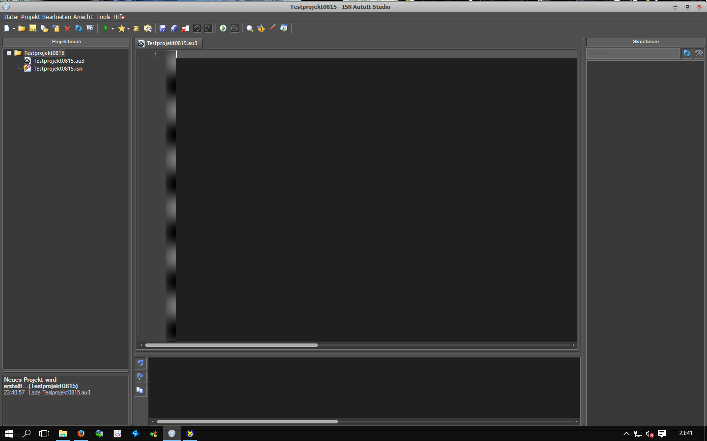 Ich habe das Projekt erstellt, während ich das Dark Theme genutzt habe. Anschließend habe ich Themes abgeschaltet und das Programm neu gestartet (damit die Änderungen übernommen werden). Offnet man nun das letzte Projekt, so werden 2 mittleren Editorfenster noch in der dunklen Farbe dargestellt (Hier wird sowohl Farbe, als auch Schriftformatierung aus dem Dark Theme genutzt). Die Treefenster (Dateien links und Skriptbaum rechts) haben zwar die korrekte Hintergrundfarbe, aber noch die Weiße Schriftfarbe, sodass man dort nichts lesen kann. (Screenshot3)