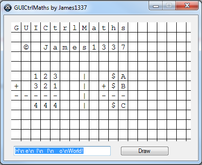 _GUICtrlMaths_SetText($Graphic, 'GUICtrlMaths\n \n © James1337\n \n \n 123 | $A\n+ 321 | +$B\n----- | ---\n 444 | $C', 0)