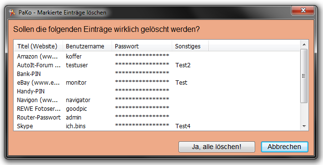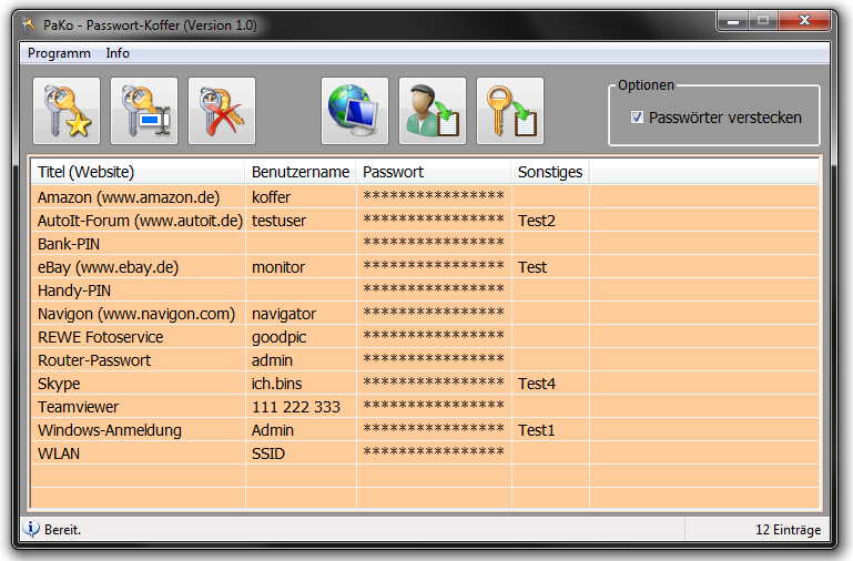 Damit kann man Benutzername/Passwort-Kombinationen (z.B. für Online-Foren, Shops, etc.) verwalten. Die Datenbank wird mit einem Master-Passwort verschlüsselt.