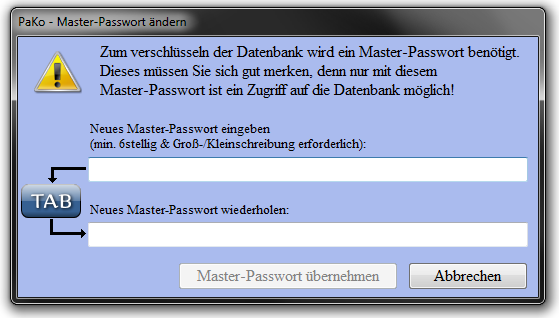 Dieses Master-Passwort muss man bei jedem Programmstart eingeben. Ohne dieses Master-Passwort kommt man nicht mehr an die Daten ran! Also gut merken!