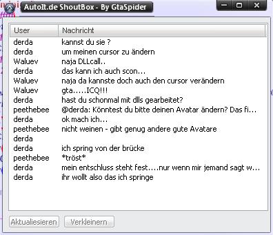 Jo.. missing future.. habs eigentlich nur für mich geschrieben damit ich immer weis was grad so in der shout abgeht.. und wenn iwas wichtiges ist hab ich den firefox geöffnet ;) Aber ich bin dabei es einzubauen.. muss jetzt nur noch gucken welche php seite mit welchen parametern geöffnet wird wenn geshoutet wird..