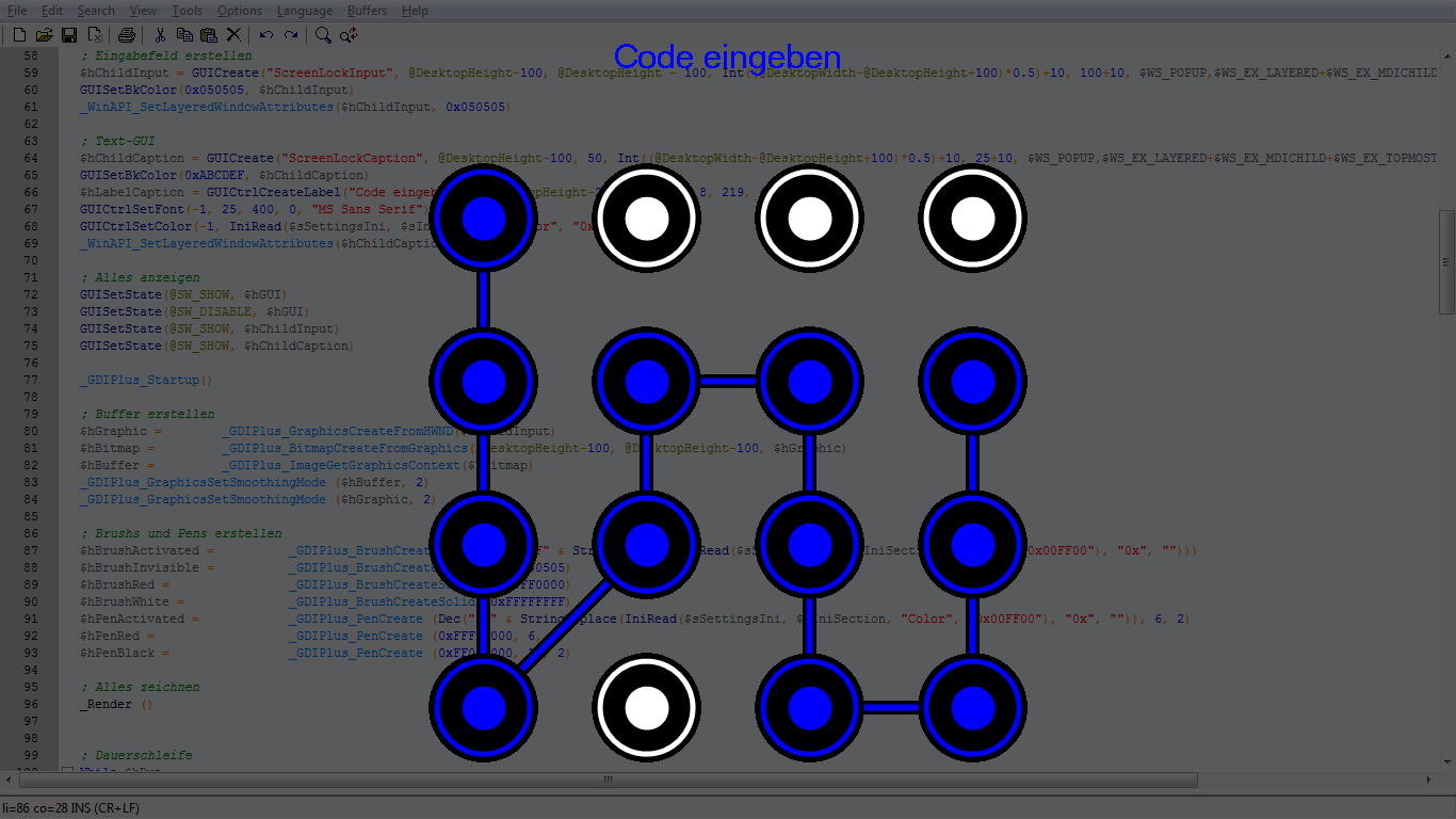 Sicherlich kennt fast jeder von euch die Handysperre per Muster. Diese habe ich nun in AutoIt umgesetzt, da mir der normale Windows-Sperrbildschirm ziemlich langweilig erschien und ich nicht jedesmal mein Passwort eintippen wollte.