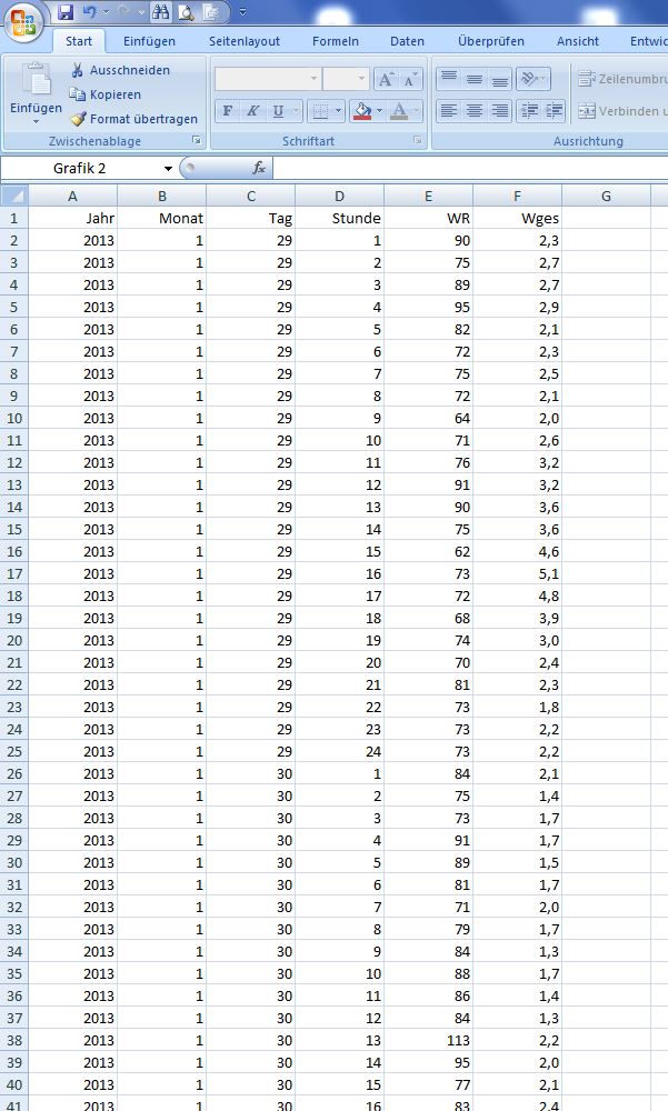"Jahr", "Monat", "Tag", "WRI", "Wges" in die Zellen A1 bis E1?