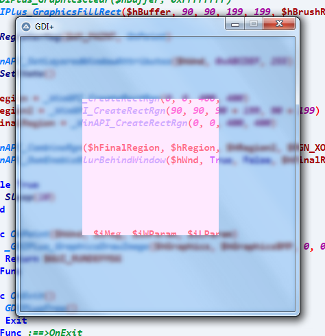 Nun, wie man sieht, übermalen wir mit dem später gezeichneten Kreis einen Teil von dem Quadrat. Um den nächsten Schritt besser kenntlich zu machen, werden wir zuerst den Hintergrund unserer Leinwand wirklich weiss färben müssen. Um eine komplette Leinwand in einer Farbe einzufärben, können wir einfach die Funktion _GDIPlus_GraphicsClear benutzen. Diese Funktion akzeptiert ausnahmsweise direkt den Farbwert. Dieses Einfärben muss vor dem Zeichnen der Formen erfolgen, ansonsten würden wir diese komplett übermalen. Als Farbe nutzen wir ein komplett reines Weiss: 0xFFFFFFFF.