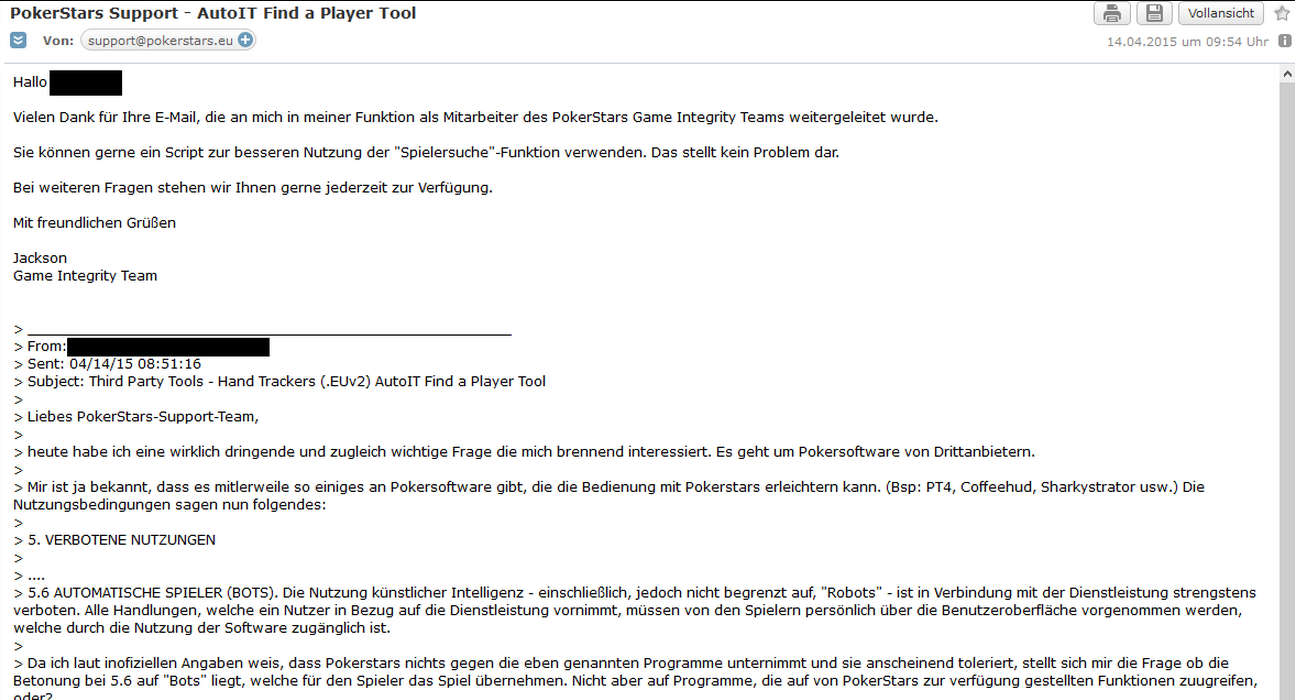 Gibt es einen Weg an den ich nicht gedacht habe? Speicher auslesen mit ner APIHook scheint etwas zu extrem und PixelSearch zu einfach, da das Programm wenn möglich im Hintergrund ablaufen soll. Wenn jemand einen Lösungsvorschlag, eine Idee oder Richtung kennt, die mir hier weiterhelfen könnte wäre ich für jede Inspiration sehr dankbar. Falls Ihr mehr Informationen benötigt, gebt mir bescheid, dann tue ich mein Bestes um euch diese schnellstmöglich zu liefern. PokerStars ist zudem kostenlos downloadbar, falls sich jemand mal intensiever daran probieren möchte. Hier ist mein Code. Ist ja noch am Anfang aber macht ja wenig Sinn weiter zu machen, sofern derartige Probleme unklar sind. Nicht wundern, dass hier keine falschen Lösungsansätze drinstehen, macht ja keinen Sinn, wenn es nicht funktioniert.