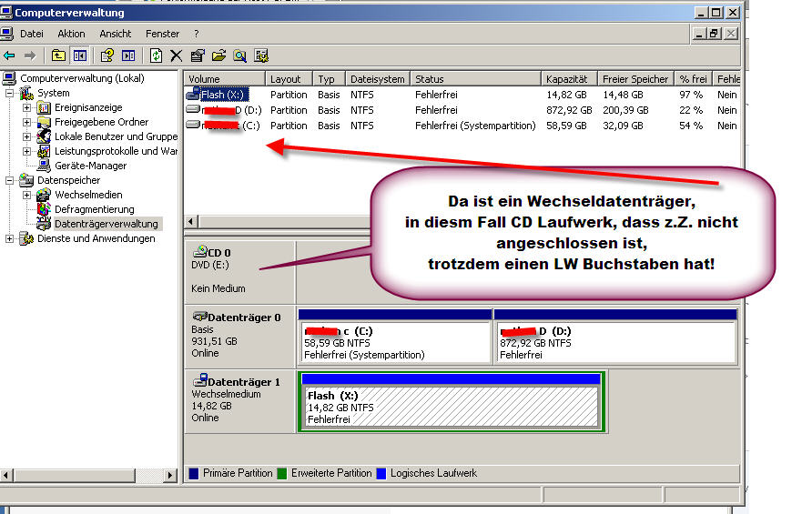 - bei Windows XP unter „Verwaltung“ => „Computerverwaltung“ => „Datenträgerverwaltung“