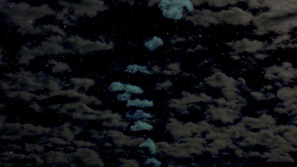 Direkt über mir ist ein Licht (das man nur indirekt, anhand der beleuchteten Wolken sehen konnte, das "Licht" selbst hatte keine Substanz und keinen hellen "Punkt" oder ähnliches) "entstanden" und hat sich entlang einer ca. 10-20km langen gebogenen Linie über den Himmel bewegt. Die Geschwindigkeit lag bei ca. 10-15km/s (konstant, also das Licht war auf der kompletten Strecke gleichschnell). Dabei konnte man das Licht selbst nicht sehen, aber die Wolken wurden entlang der gedachten Linie nacheinander sehr gleichmäßig blitzblau (nicht so hell wie ein Blitz, aber mit der gleichen Farbe) beleuchtet. (Man kann sich das wie eine LED-Kette vorstellen, nur mit Wolken. Wie als könnte man sie an- und abschalten. Eine Lichtausbreitung innerhalb der Wölkchen konnte ich nicht sehen, sie waren also sofort komplett leuchtend, dann blieben sie kurz an, und sind dann komplett wieder erloschen, es haben nie 2 Wolken gleichzeitig geleuchtet). Dieses "Entstehen -> Davonfliegen/Davonfahren (Entlang der kleinen Wolken) -> Verschwinden" trat ca. 50-100x innerhalb von 2 Minuten auf, dabei haben die Lichter meistens den gleichen Weg benutzt (es gab aber auch ein paar Lichter die einige Wölkchen neben der "Quelle" entstanden sind, oder einige Wölkchen neben der "Senke" verschwunden sind, andere Wege vom Start zum Ziel wurden nicht gewählt). Dann passierte eine viertel Stunde lang nichts, bis das Phänomen nochmal für ca. eine Minute auftrat. Anschließend war und blieb der Himmel dunkel.