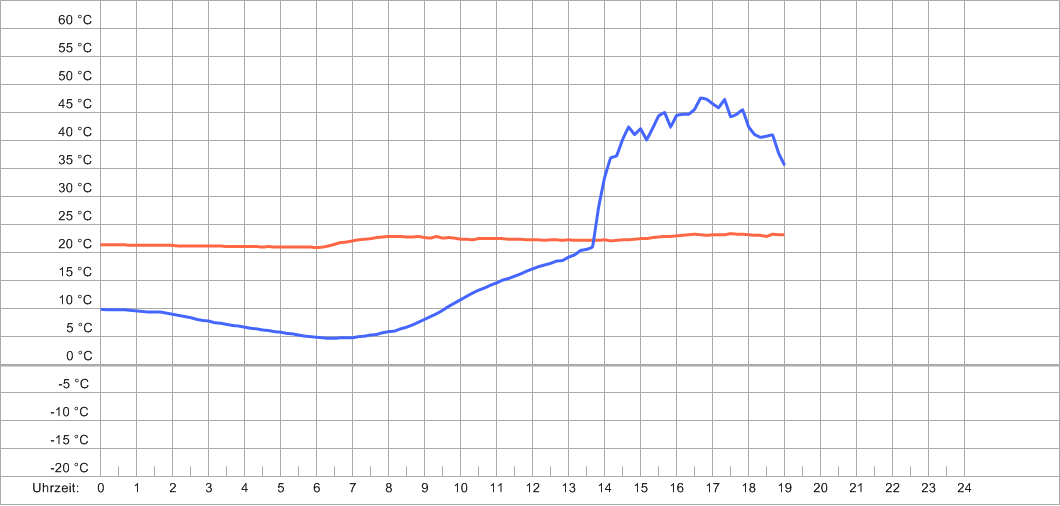 Die blaue Kurve stellt die Außentemperatur dar und die orange Kurve die Innentemperatur. Wobei ich anmerken muss, dass der Sensor nach Westen hin ausgerichtet und so ab ca. halb zwei der direkten Sonneneinstrahlung ausgesetzt ist.