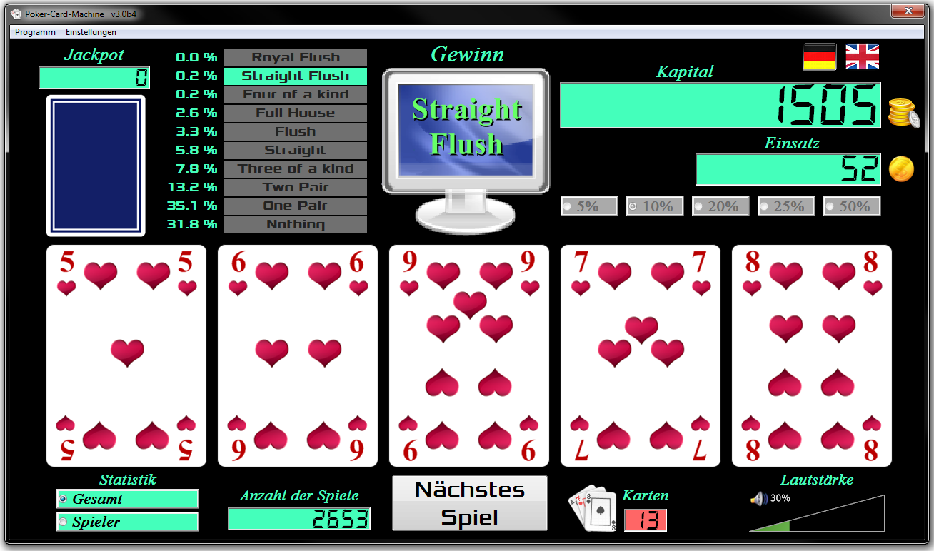 Abgesehen davon ist das Pokerspiel echt klasse geworden. Die Animation der Karten, der Sound und der grafische Aufbau sprechen mich zum weiterspielen an. Klasse gemacht.