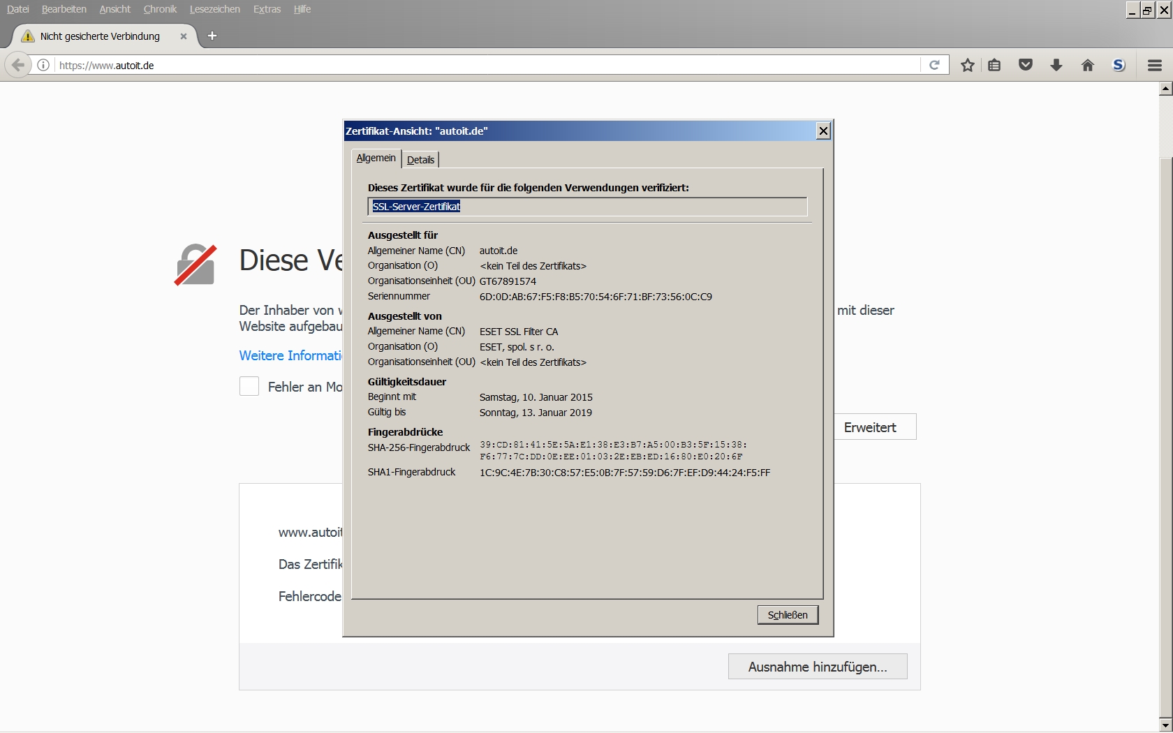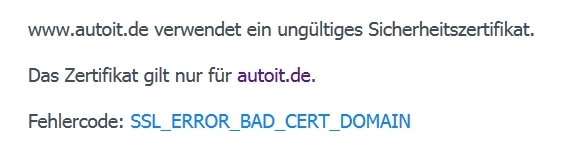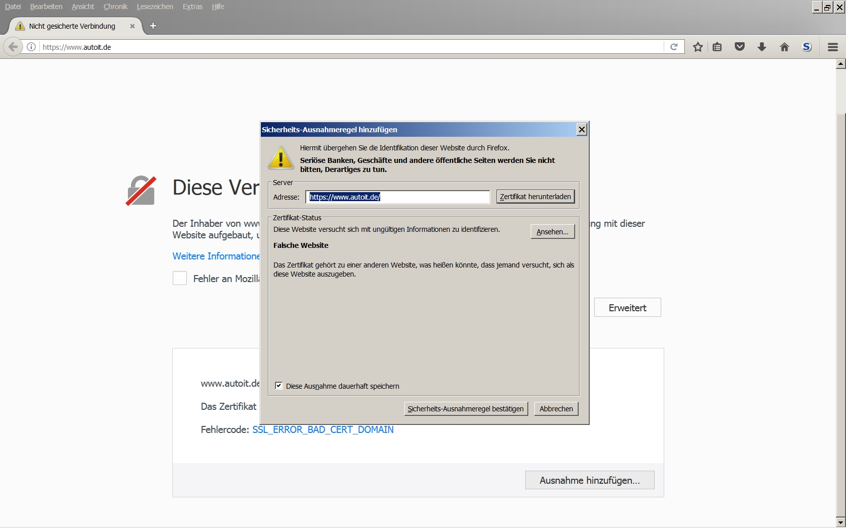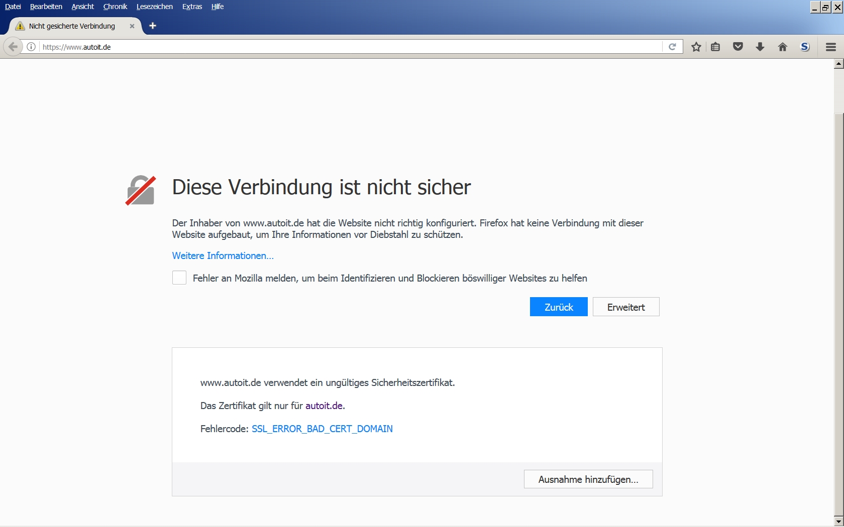 Erst durch das Hinzufügen einer "Sicherheits-Ausnahmeregel" konnte ich die Website wieder erreichen.