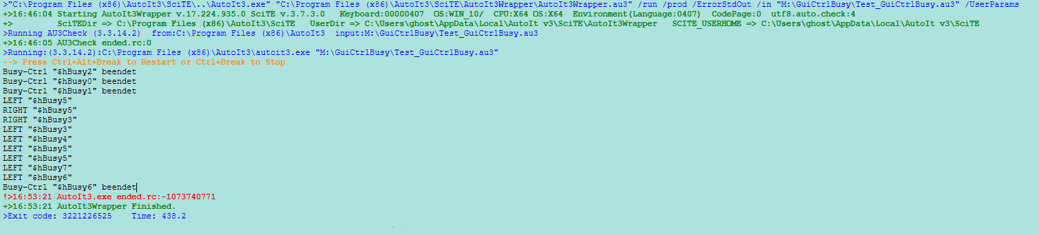 Wenn in allen relevanten Funktionen überprüft wird, ob ein gültiges Window-Handle übergeben wurde und andernfalls direkt wieder mit Return SetError(1, ...) rausgesprungen wird, können alle BusyCtrl's in beliebiger Reihenfolge mit einem Linksklick geschlossen werden, insofern sie nicht bereits durch ein gesetztes TimeOut gekillt wurden. Nachdem alle BusyCtrl's geschlossen wurden (das letzte mit Linksklick), werden zwei weitere BusyCtrl's erstellt... die sich dann auch wieder mit Linksklick schließen lassen... oder via TimeOut... bis der Arzt kommt.