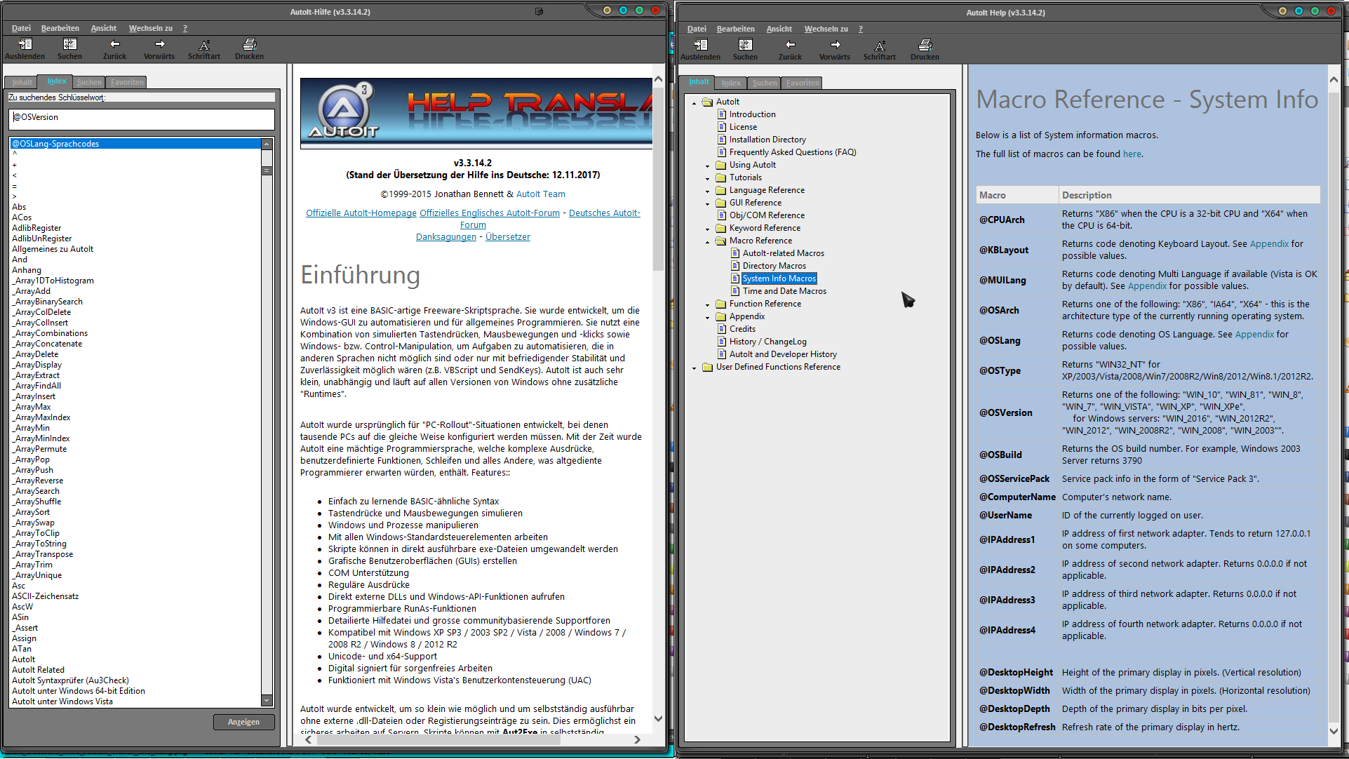 Die englische Hilfe springt zum Tab Inhalt und wählt die entsprechende Unterkategorie aus... bei @UserProfileDir ist es Verzeichnis, bei @error AutoIt Related, die deutsche springt zum Tab Index und das war es dann.