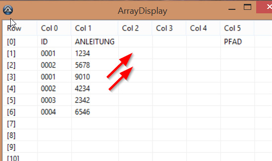Ziel soll nachher sein, dass ich in einer Combox die jeweilige ID auswähle (ich kriege es auch nicht hin, die ID-Werte aus dem Array da anzuzeigen) und dann die bis zu 4 Anleitungen, die dann in der jeweiligen Spalte hinter der ID stehen, in der GUI zur Anzeigen bringen kann.