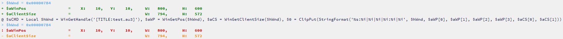 Local $sCMD = "Local $hWnd = WinGetHandle('[TITLE:"&@ScriptName&"]'), $aWP = WinGetPos($hWnd), $aCS = WinGetClientSize($hWnd), $0 = ClipPut(StringFormat('%s:%i|%i|%i|%i:%i|%i', $hWnd, $aWP[0], $aWP[1], $aWP[2], $aWP[3], $aCS[0], $aCS[1]))"