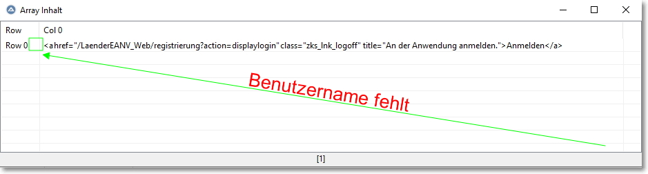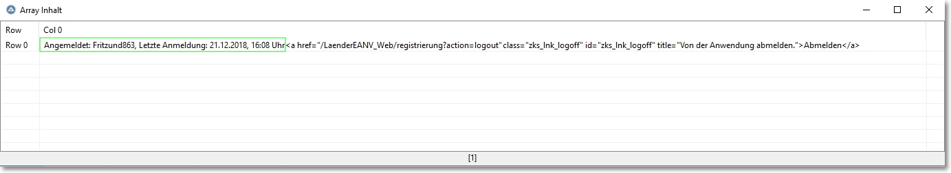 Code;(3)Benutzername und Passwort senden (POST) ConsoleWrite("Benutername in der ZKS_Abfrage ist: " & $sBenutzerName & " mit dem Passwort: " & $sPasswort & @CRLF) $sPOST = 'action=login&uname=' & $sBenutzerName & '&password=' & $sPasswort & '&login=login' ConsoleWrite("$sPOST ist: " & $sPOST & @CRLF) $sPaket = _WinHttpSimpleSSLRequest($hConnect, 'POST', '/LaenderEANV_Web/registrierung', 'https://leanv.zks-abfall.de/LaenderEANV_Web/registrierung?action=displaylogin', $sPOST) _FileWrite($sPaket) ; schreibe eine Kontroll HTML Datei ; 3a)An dieser Stelle läuft was schief. Die erste Anmeldung geht, beim 2. Durchgang wird die neue Anmeldung - warum auch immer - nicht akzeptiert $aTestString = _StringBetween($sPaket, '<div id="zks_loginf">', '</div>') ; schauen, was in der Zwischenablage liegt _ArrayDisplay($aTestString, 'Array Inhalt') ; hier will ich überprüfen, ob die Anmeldung erfolgreich war.Hier nochmals der Link, wo das ganze Script zu sehen ist: