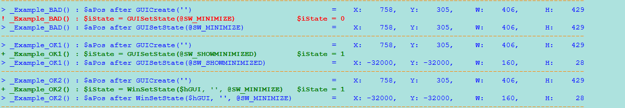 WinGetPos liefert nicht wie erwartet die Position und Größe des minimierten Fensters, wenn direkt nach GUICreate('') ein GUISetState(@SW_MINIMIZE) ausgeführt wird