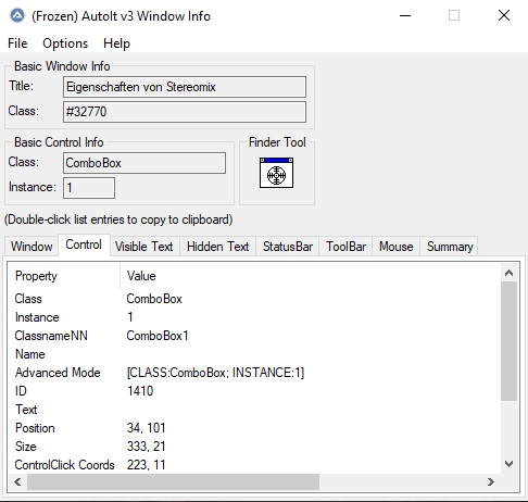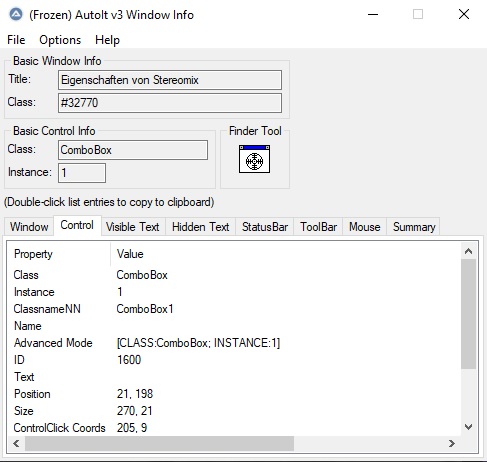 • Ich nochmal. ControlCommand ("[CLASS:ComboBox]", "", 1600, "SelectString", "Lautsprecher (GameDAC Game)") habe ich durch ControlCommand ("[CLASS:#32770]", "", 1600, "SelectString", "Lautsprecher (GameDAC Game)") ersetzt. Ändert leider auch nichts.