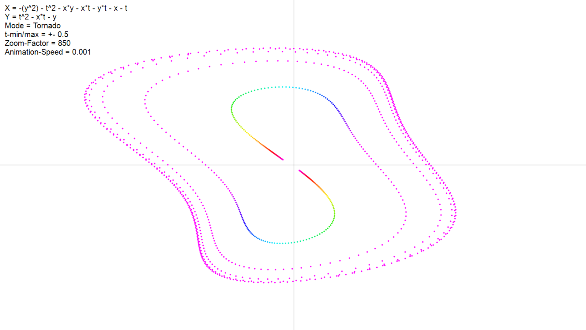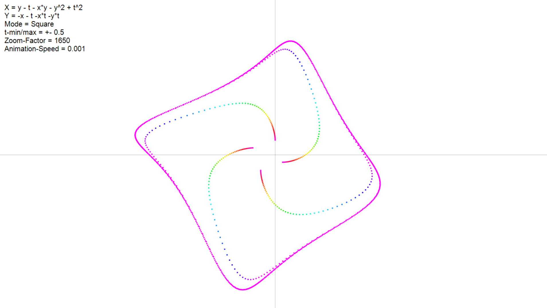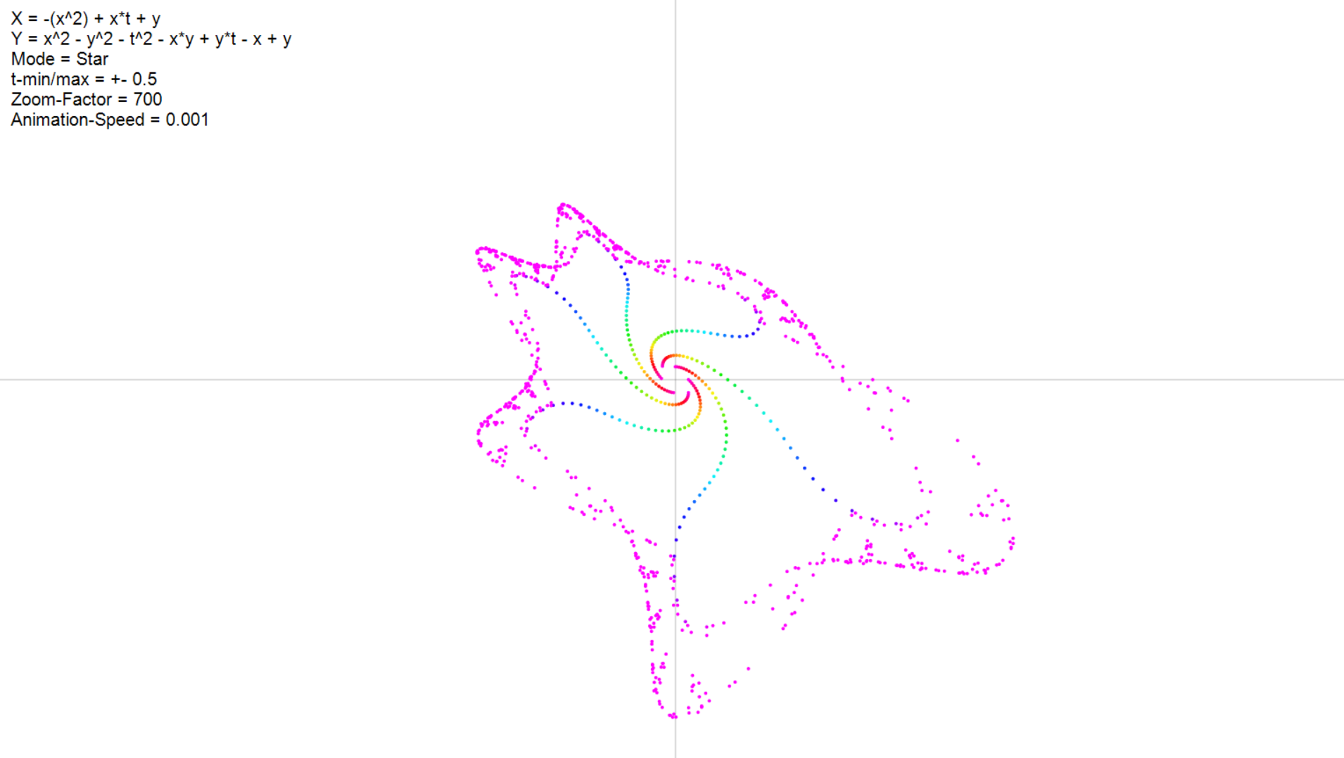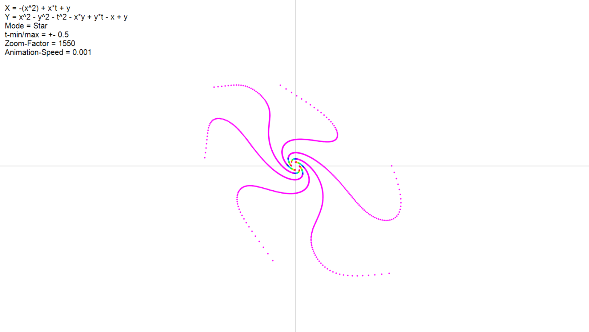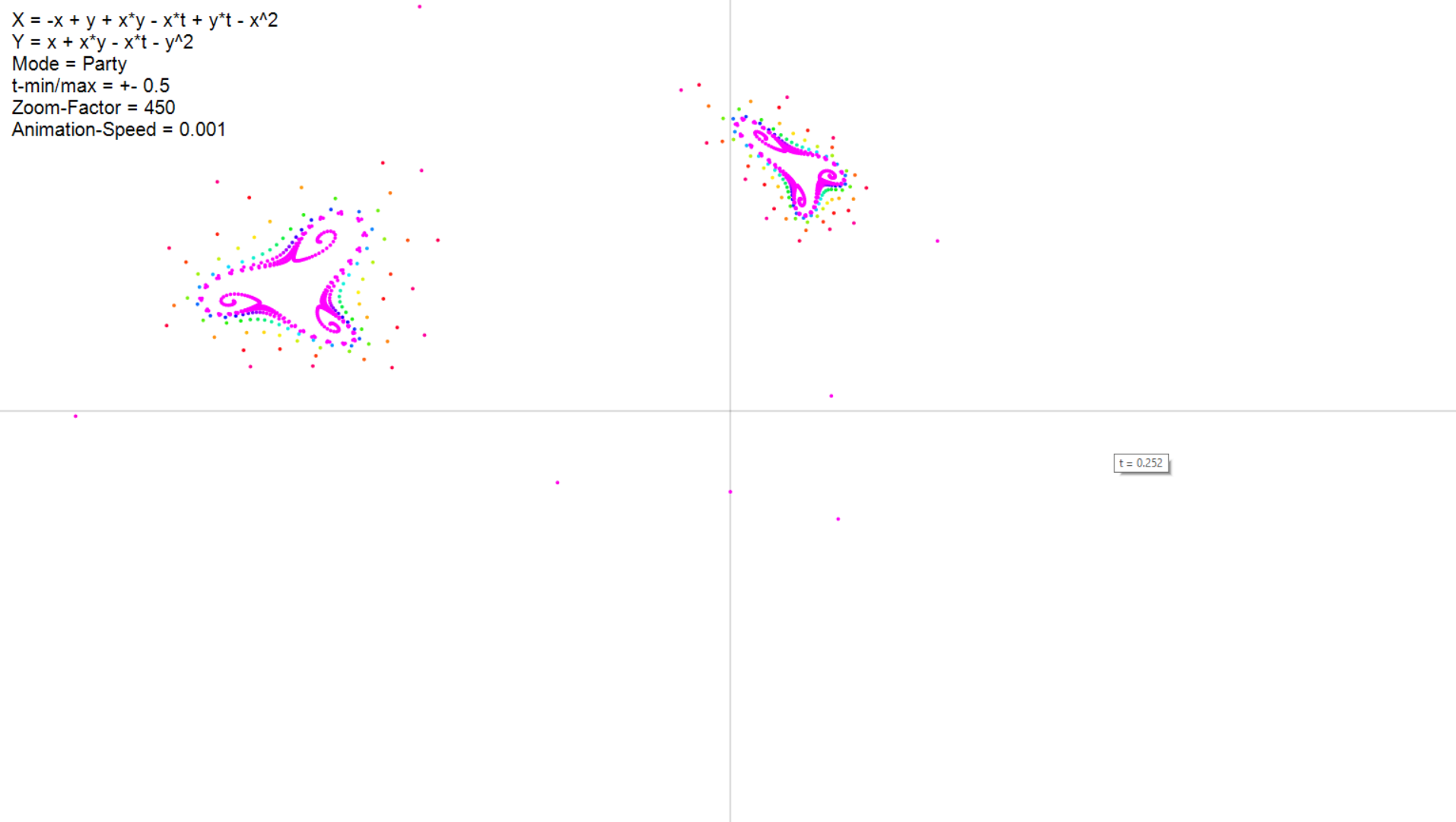 - Im Video sieht man so etwas ähnliches wie einen "Pfad" der einzelnen Punkte, was einen coolen Effekt hervorbringt. Dies habe ich auch versucht, indem ich alle Punkte des vorherigen Schrittes in einem Array gespeichert habe, und lediglich Verbindungslinien von "alten" zu "neuen" punkten gezeichnet habe. Jedoch sieht das ziemlich blöd aus und ist ziemlich ineffizient denke ich.