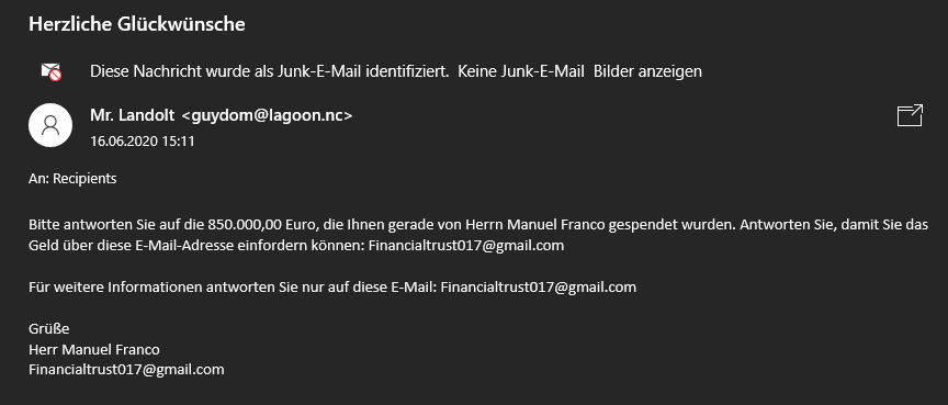 Der nette Herr Manuel Franco hat mir 850.000€ gespendet. Echt ein netter Typ.