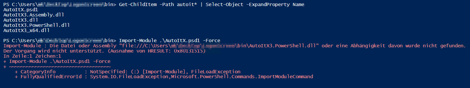 Sehr gerne möchte ich das AutoItX Modul für PowerShell nutzen. Auf meinem Arbeitsplatz, auf dem ich AutoIt installiert ist, funktioniert es einwandfrei. Jetzt möchte ich diese Cmdlets auf Rechner nutzen, auf denen kein AutoIt installiert ist. Die benötigen Dateien habe ich, wie in der Hilfe beschrieben ist, auf die Rechner kopiert und die Sicherheitsblockade der Dateien aufgehoben. Leider schlägt der Versuch, das Modul zu importieren, mit dieser Fehlermeldung fehl:
