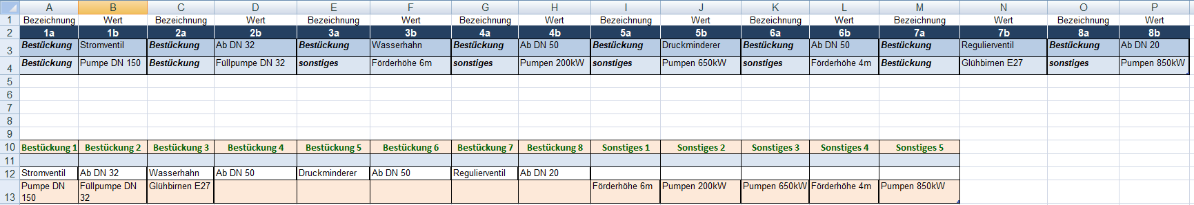 Bei Zeile 3 ist es relativ einfach. Diese beinhaltet 8 verschiedene Werte jeweils mit der Bezeichnung "Bestückung". Der Wert der Bestückung aus der Spalte 1b in Zeile 3 muss in der Spalte Bestückung 1 in Zeile 12 kopiert werden.