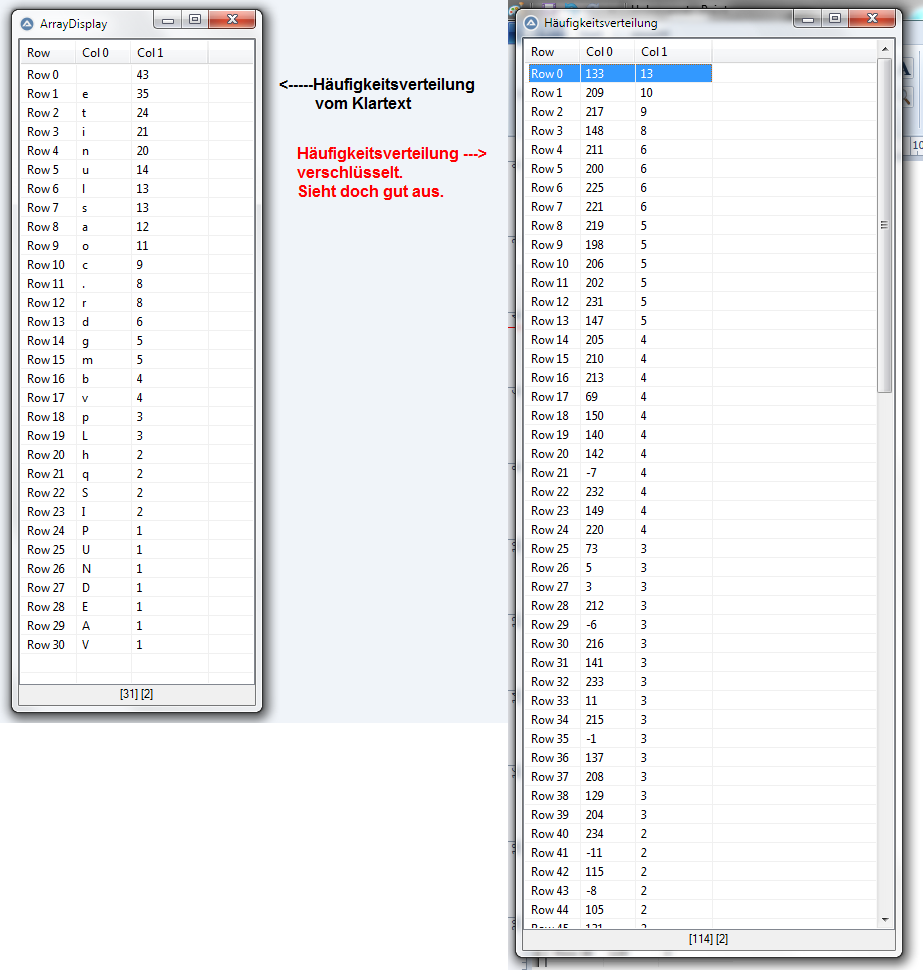 • Was sagt Ihr zu dem Verhältnis der Häufigkeitsverteilung "Klartext" vs "Verschlüsselt"?
