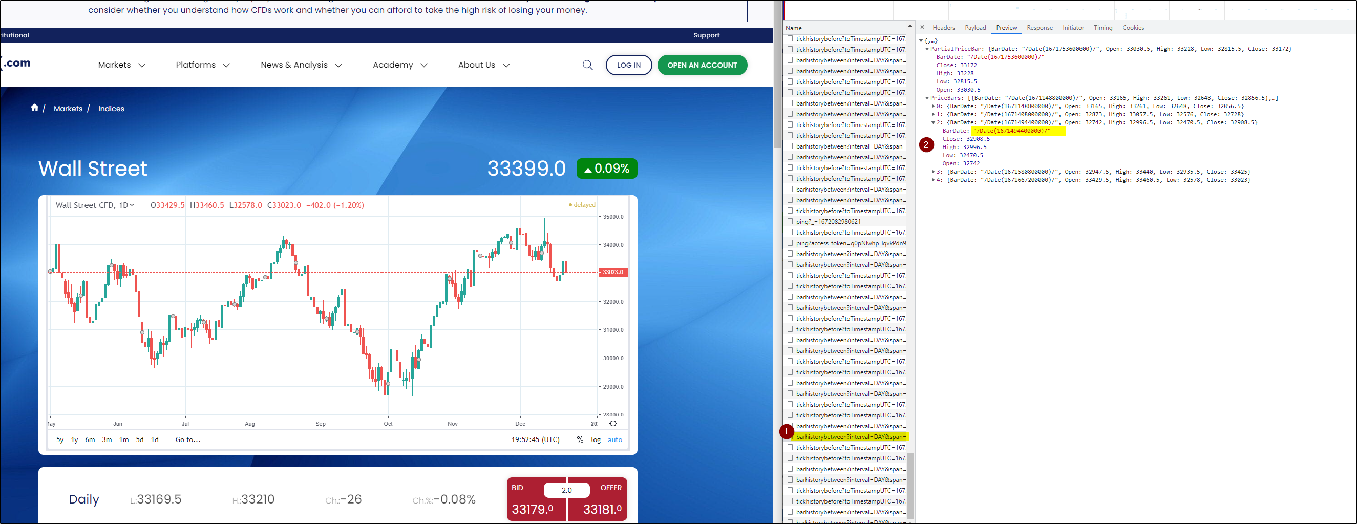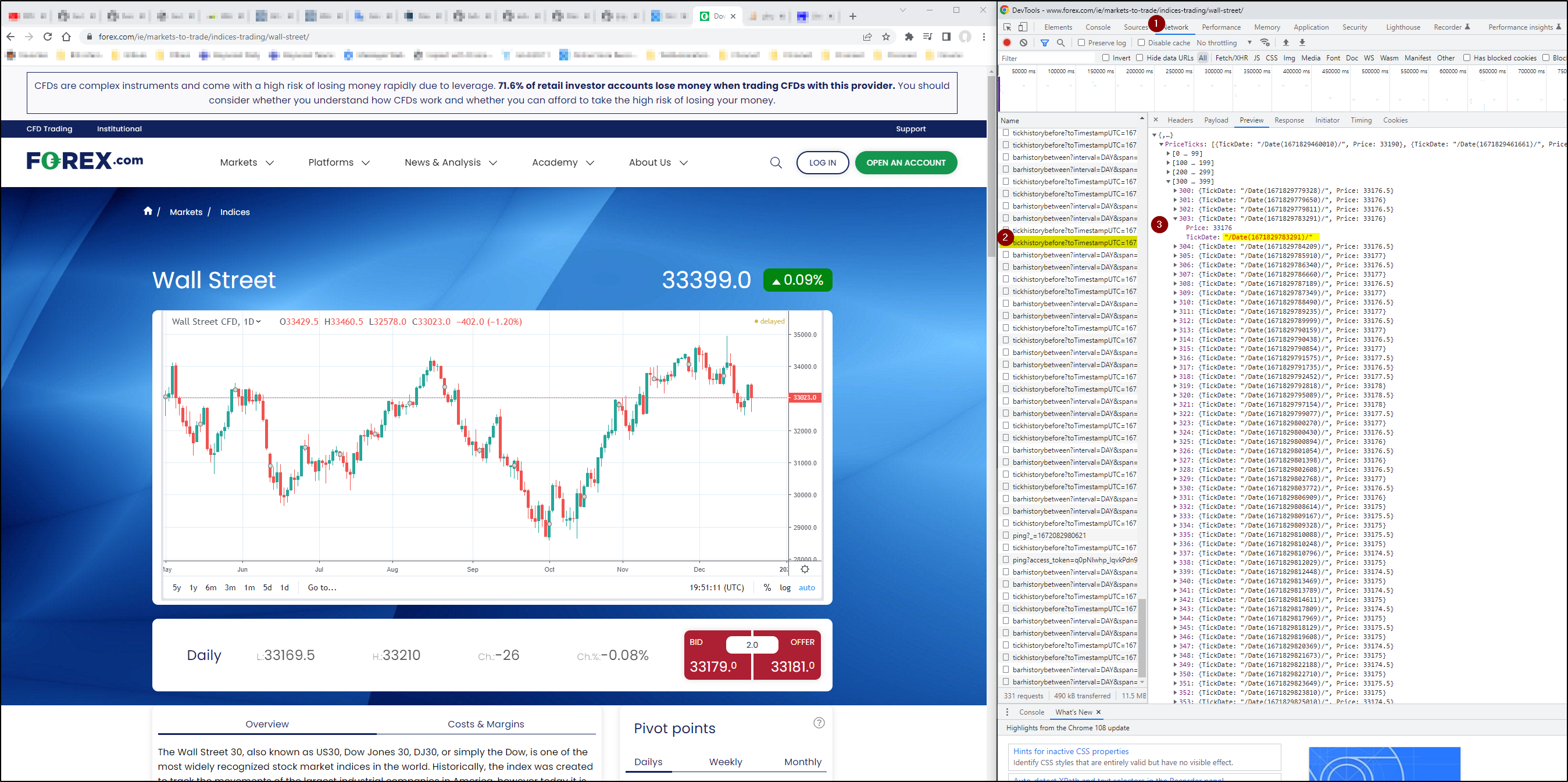 ich würde gerne auf dieser Seite "https://www.forex.com/ie/markets-to-trade/indices-trading/wall-street/" die werte aus dem Chartbild auslesen, leider sind die Werte im Quellcode nicht enthalten da sie vermutlich mit Javascript nachgeladen werden. ich habe versucht die URL im "Entwicklertool/Netzwerk" herauszufinden, die die Werte enthält, habe ich aber nicht gefunden. Ich vermute, dass das irgendwie anders funktioniert. Gibt es dafür eine Möglichkeit? Zur nur auch nur die Werte, die einem im oben Chart dynamisch angezeigt werden ja nachdem wo man mit der Maus gerade ist.