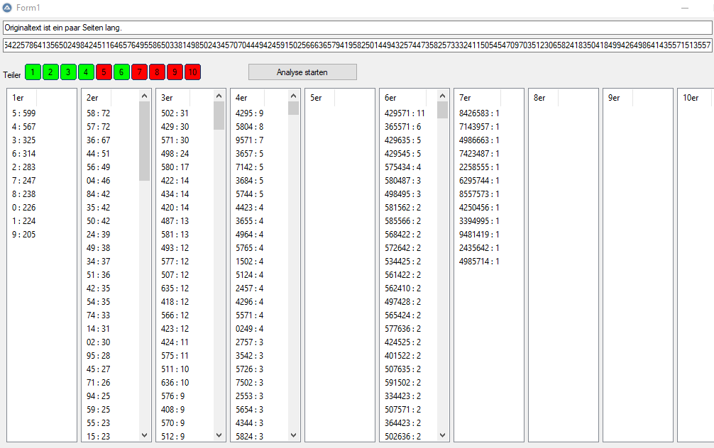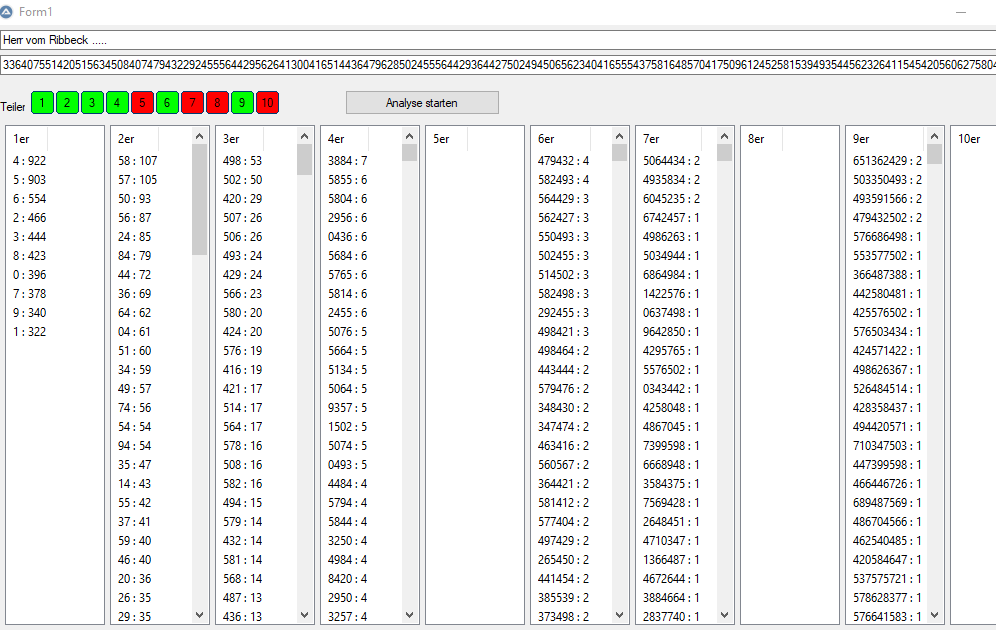 Nach der Analyse soll er dann nicht nur die am 10 häufigsten vorkommenden Zahlen speichern, sondern alle vorkommenden Zahlen und deren Häufigkeit. Eine Datei mit den 1_er, die nächste mit den 2_er, dann die 2_er+, usw.