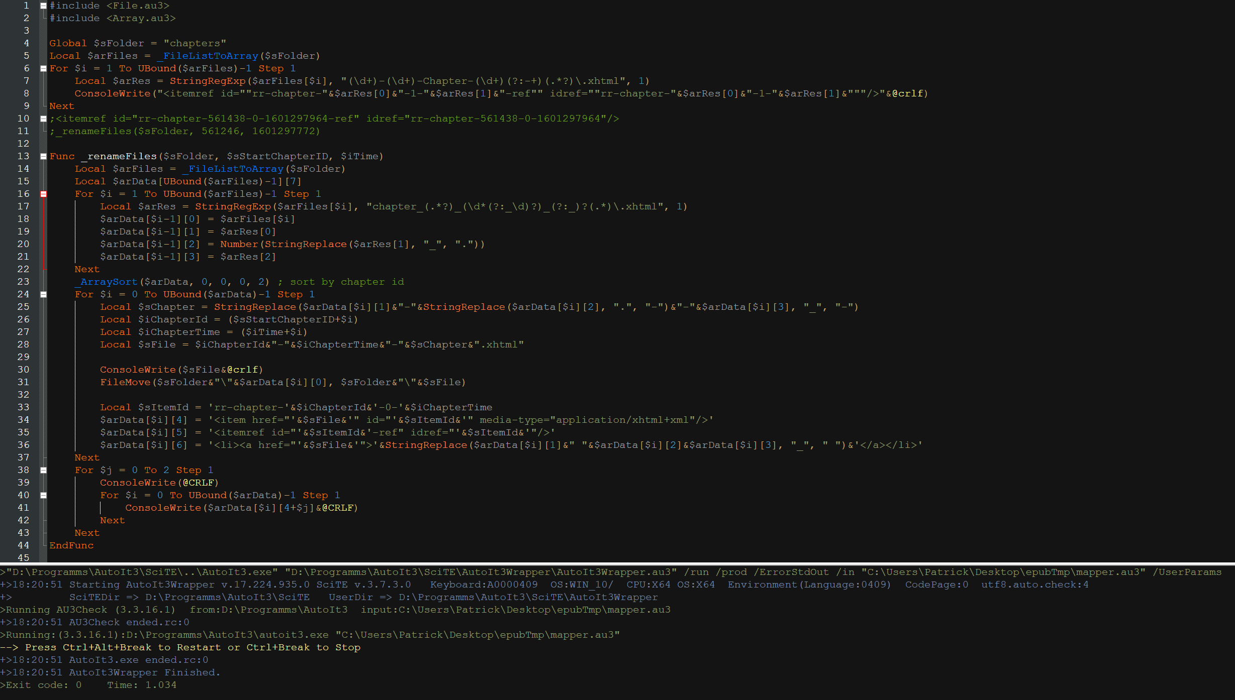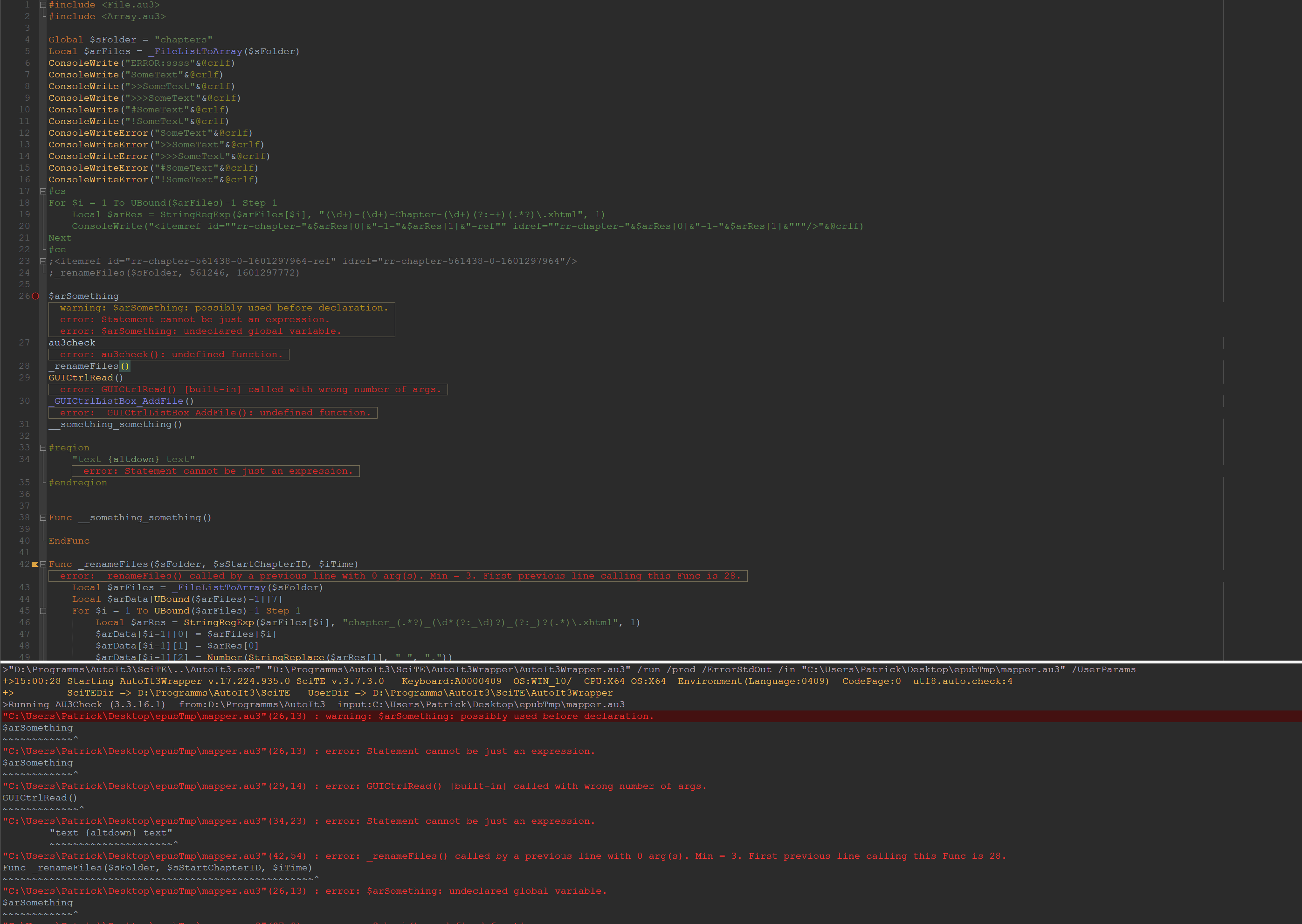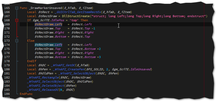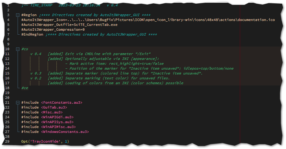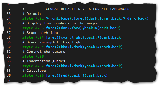 • Mit SciTE ein Dark Theme zu verwenden ist (beim ersten mal) etwas aufwändig. Es genügt ja nicht die Farben in den Styles von AutoIt zu ändern - es müssen sämtliche Properties rausgesucht werden, die eine Farbe verwenden.
