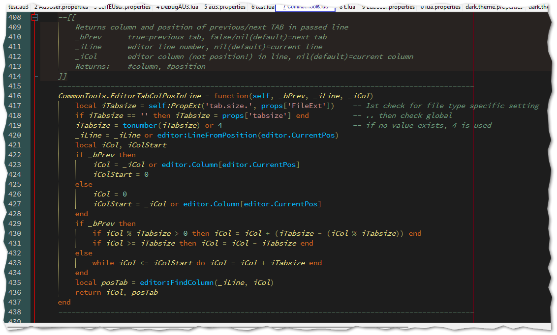 Zum Verwenden des Lua-Dark-Themes genauso verfahren: Abspeichern im o.g. Pfad und am Ende der SciTEUser.properties eintragen: import dark.theme.lua