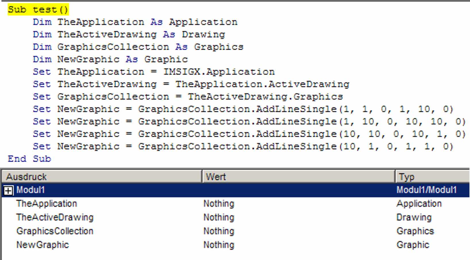Hier noch ein paar Screenshots von der VB-IDE, wenn man im Schrittbetrieb die komplizierte Struktur des referenzierten Objekts der COM-Schnittstellen-DLL "aufblättert":