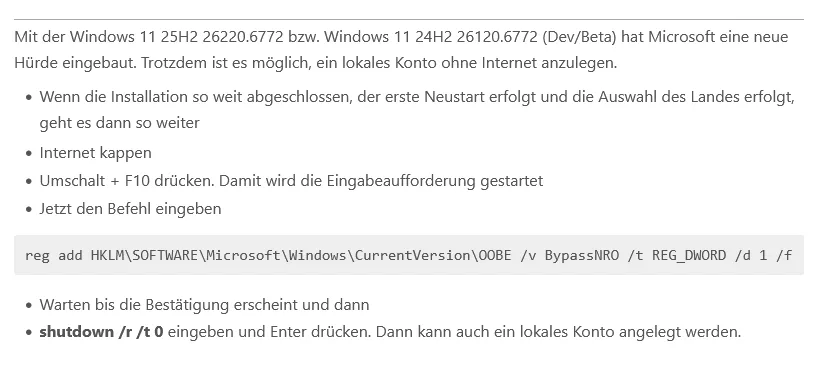 Und zur Installation von Win11 ohne MS-Konto habe ich das hier befolgt (kein Netzwerkkabel anschliessen oder per WLAN verbinden! )