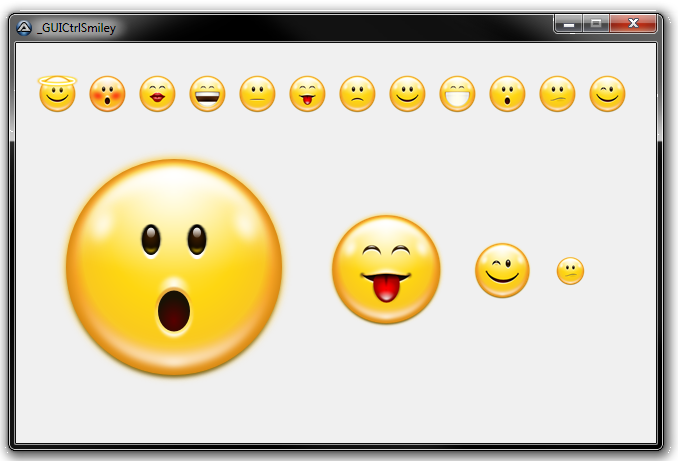 Damit kann man einen/mehrere Smiley(s) auf der Gui erzeugen ("_GUICtrlSmiley_Create"). Es stehen 12 verschiedene Smileys zur Verfügung, die man mit ("_GUICtrlSmiley_SetData") ändern kann. Hier gibt es auch noch die Möglichkeit die Größe der Smileys festzulegen. Standardgröße ist 256 Pixel, alle anderen Größen werden vor der Anzeige skaliert.