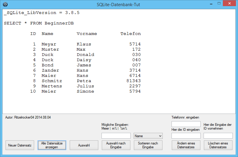_SQLite_Exec(-1, "INSERT INTO BeispielDB(Name,Vorname,Summe) VALUES ('Muster','Max',500);");~ ### Beispiel-Abfragen formulieren. ###