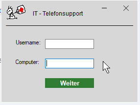 Alles anzeigenLocal $tel_GUI = _Metro_CreateGUI("", 280, 210,-1,-1,True) ;Add control buttons Local $Control_Buttons_tel = _Metro_AddControlButtons(True,False,True) ;Set variables for control buttons Local $GUI_CLOSE_BUTTON = $Control_Buttons_tel[0] Local $GUI_MINIMIZE_BUTTON = $Control_Buttons_tel[3] $label_tel = GUICtrlCreateLabel("Support",65,20,110,25) GUICtrlSetFont($label_tel, 9, 300, 0, "Arial") $n = GUICtrlCreatePic(@ScriptDir & "\bin\images\rotkreuz_gr.jpg", 12, 10, 38, 30) $lb1 = GUICtrlCreateLabel("Username:", 30, 80) $telEdit1 = _GUICtrlEdit_Create($tel_GUI, "erf", 90, 80, 100, 20, $ES_AUTOHSCROLL) $telButton = _Metro_CreateButton("Weiter", 90, 160, 100, 20) GUISetState()die GUI sieht dann so aus.