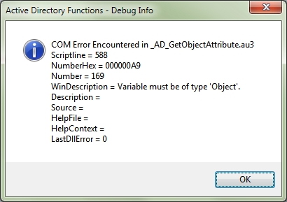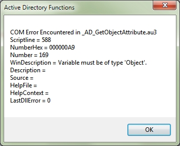 Leider wird mir eine Fehlermeldung angezeigt:CodeC:\Program Files (x86)\AutoIt3\Include\AD.au3 (621) : ==> Error in expression.: Local $sAD_SchemaNamingContext = $oAD_RootDSE.Get("SchemaNamingContext") Local $sAD_SchemaNamingContext = ^ ERRORWin7 x64