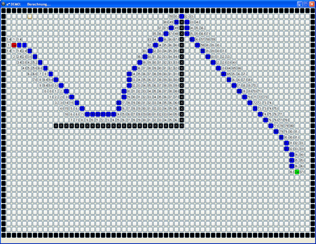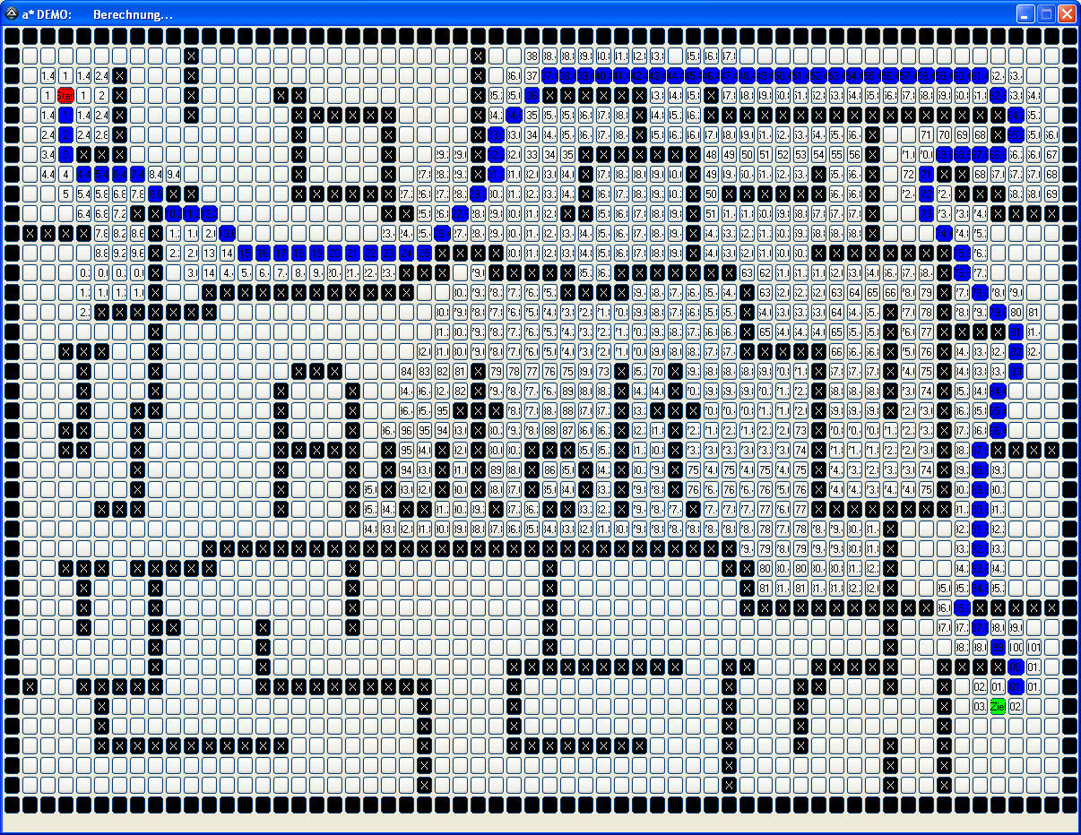 So kann man auch ein Labyrinth erstellen, durch das sich a* den kürzesten Weg zum Ziel sucht....