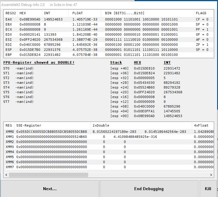 Im Debugger-Fenster werden bei mir die übergebene Parameter um eine Position verschoben angezeigt. Z.B. die Werte von width und height stehen eigentlich in [esp+8] und [esp+12] werden aber im Debugger-Fenster unter [esp+12] und [esp+16] angezeigt.