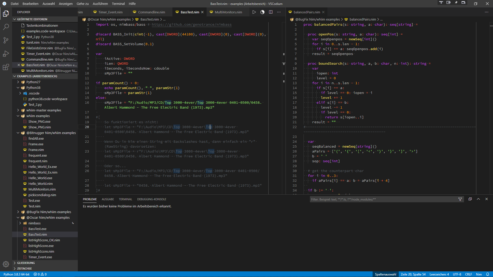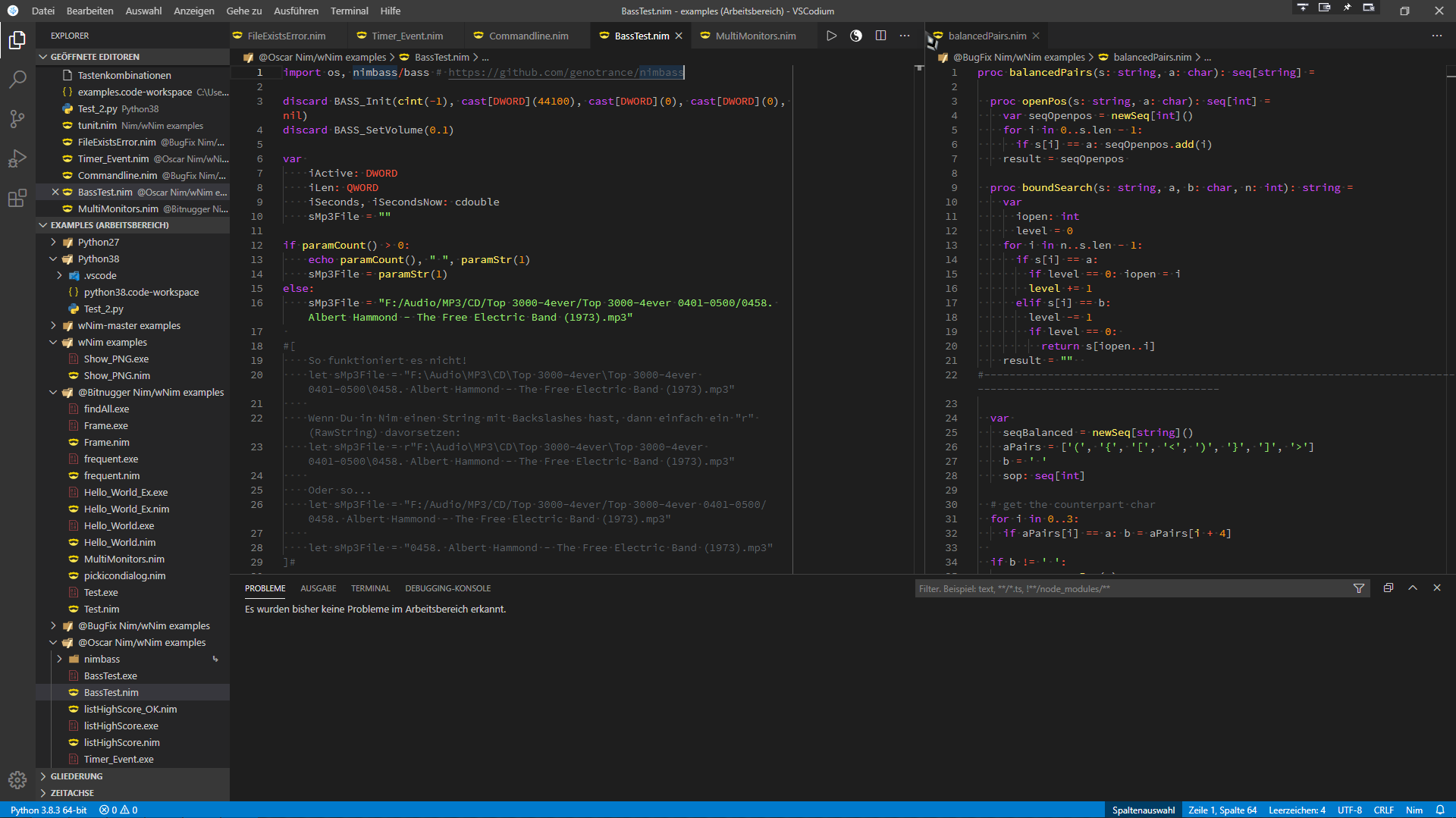 Im Bild sieht man zwei Editor-Fenster: BassTest.nim und blancedPairs.nim