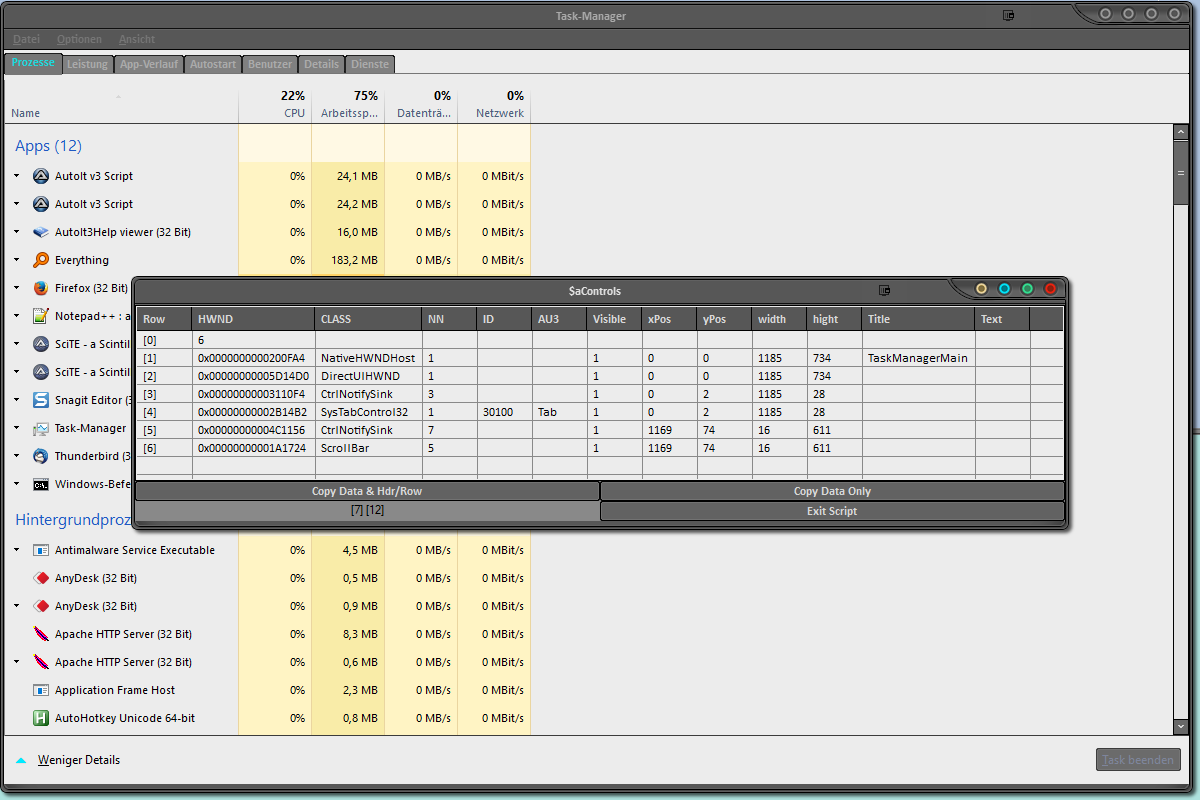 Alles anzeigen;-- TIME_STAMP 2018-01-30 23:13:03 v 0.1 #Region ;**** Directives created by AutoIt3Wrapper_GUI **** #AutoIt3Wrapper_UseX64=y #AutoIt3Wrapper_Res_requestedExecutionLevel=requireAdministrator #EndRegion ;**** Directives created by AutoIt3Wrapper_GUI **** #Region ;************ Includes ************ #Include <Array.au3> #include <WinGetControls.au3> #EndRegion ;************ Includes ************ #RequireAdmin #NoTrayIcon Opt('MustDeclareVars', 1) If Not _CallTaskMgrDetails() Then MsgBox(64, 'Taskmanager - Details', 'Es ist ein Problem aufgetreten.' & @CRLF & _ 'Der Taskmanager konnte nicht' & @CRLF & _ 'im TAB "Details" gestartet werden.') EndIf Func _CallTaskMgrDetails() Local $iPID = Run(@SystemDir & '\Taskmgr.exe') If $iPID = 0 Then Return False Local $hTaskManagerWindow = WinWait('[CLASS:TaskManagerWindow]', '') Sleep(2000) Local $iMove = WinMove($hTaskManagerWindow, '', (@DesktopWidth / 2) - 600, (@DesktopHeight / 2) - 400, 1200, 800) Send('!M') Local $aControls = _WinGetControls($hTaskManagerWindow, $WGC_SHOWVISIBLE, False, False) _ArrayDisplay($aControls, '$aControls', '', 0, Default, 'HWND|CLASS|NN|ID|AU3|Visible|xPos|yPos|width|hight|Title|Text') Return SetExtended($iMove, $iPID) EndFunc ;==>_CallTaskMgrDetails -