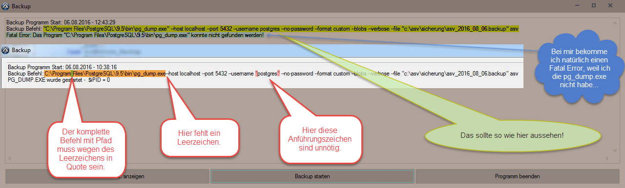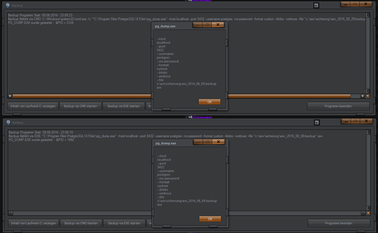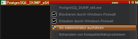 - Geht es immer noch nicht, dann benenne die c:\Program Files\PostgreSQL\9.5\bin\pg_dump.exe temporär um (pg_dump.exe.bak) und kopiere die pg_dump_test_x64.exe als pg_dump.exe nach c:\Program Files\PostgreSQL\9.5\bin\.