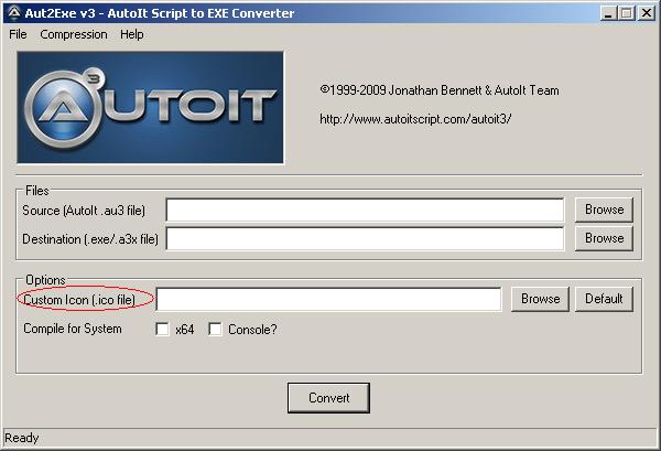 es geht auch mit dem converter von autoit, der ist normalerweise in: Start => Alle Programme => AutoIt v3 => Compile Script to .exe