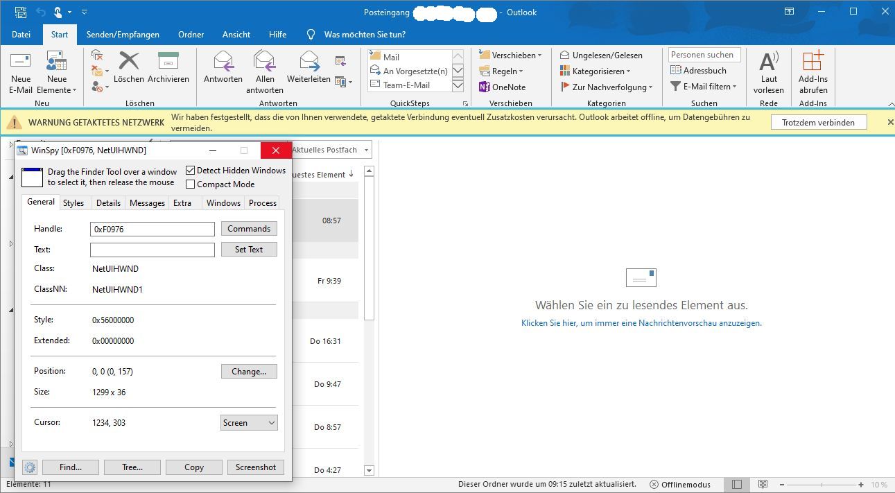 Mit dem Autoit Window Info Tool wird da nichts angezeigt, wird überhaupt in der Outlook Gui so gut wie nichts angezeigt, bis auf das Posteingangsfester.